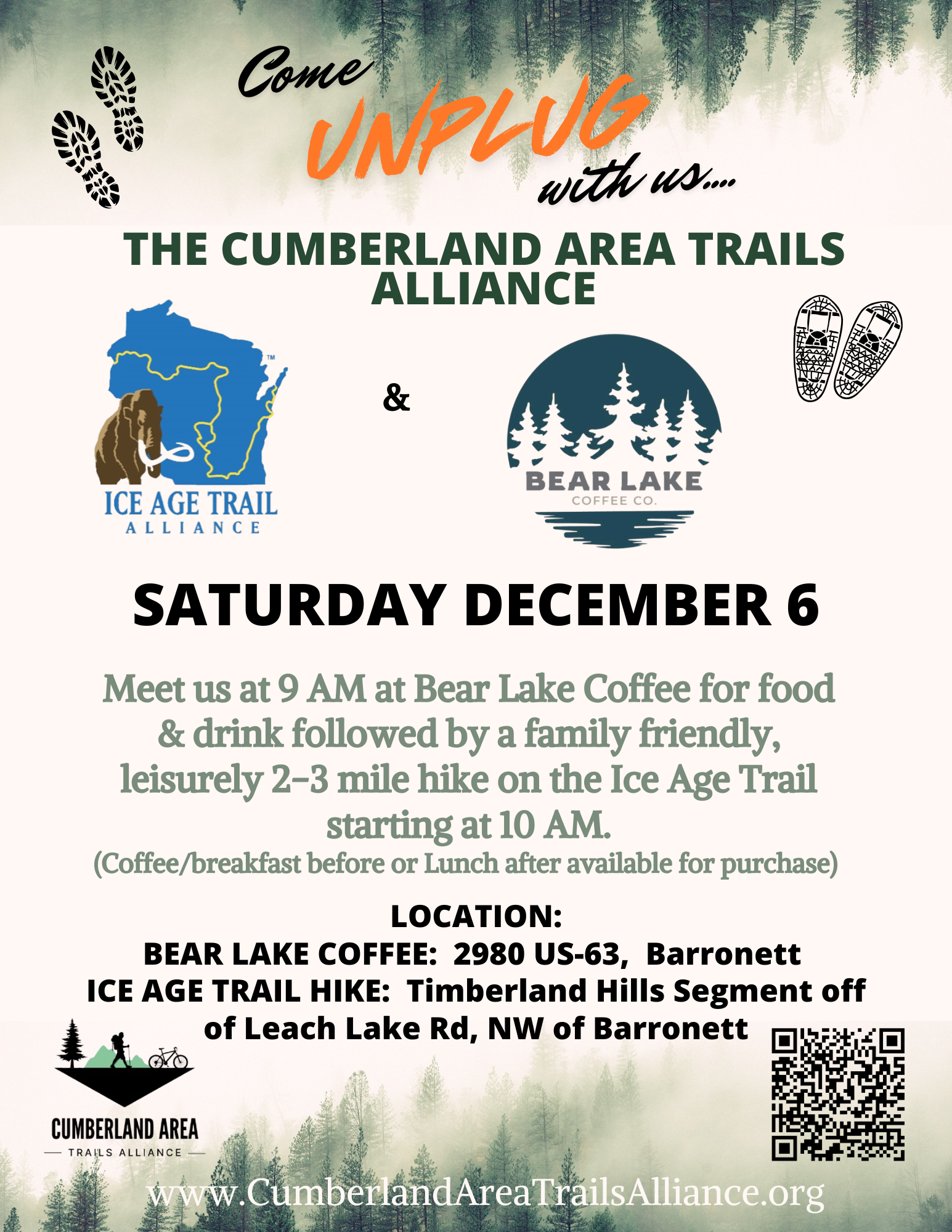 Meet us at 10AM at Bear Lake Coffee for food and drink. Followed by a family friendly, leisurely 2-3 mile out and back hike on the Ice Age Trail at 11AM. (Coffee/breakfast before or Lunch after available for purchase from Bear Lake Coffee).